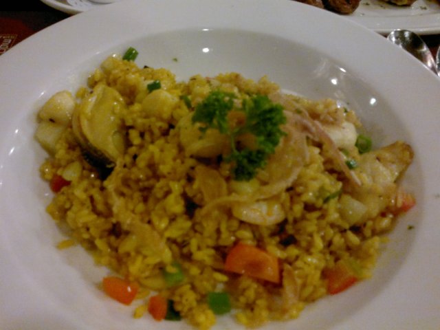 这家店位于天河城7楼,环境挺不错的,非常优雅安静,有舒缓的音乐缓缓飘出,感觉很温馨。上次和朋友来这里,我们大概11点多到的,人不是很多,不过,吃完出来,人就很多了,外面还有很多等位的。他家的西餐做得很精致,看相很好,味道也不错,上菜的速度稍微有点慢,要有耐心等才行。印象最深的就是那个芝士海鲜焗饭,米粒很大,饭的味道很香,芝士味已经渗入其中,里面放了好几样海鲜,小鲍鱼的味道很嫩、很鲜美。不过,这里的价钱偏贵了点,还要加收10%的服务费的。