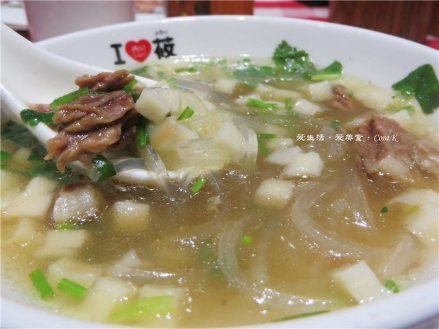 牛肉泡馍:虽然也是稍有改良版的泡馍,但却令我惊艳,盛器的形状虽然普通了些,但清汤红肉白馍绿芫荽再配上剔透的粉条,就那么小家碧玉似地安静在我面前,映衬着白底碗红心边,散发着阵阵蛊惑我的香,一勺汤,味蕾便已被收买,小方粒馍的口感没有想像中的硬,软滑得很,牛肉酥烂,配上点点香辣酱,美味得让人停不下口。