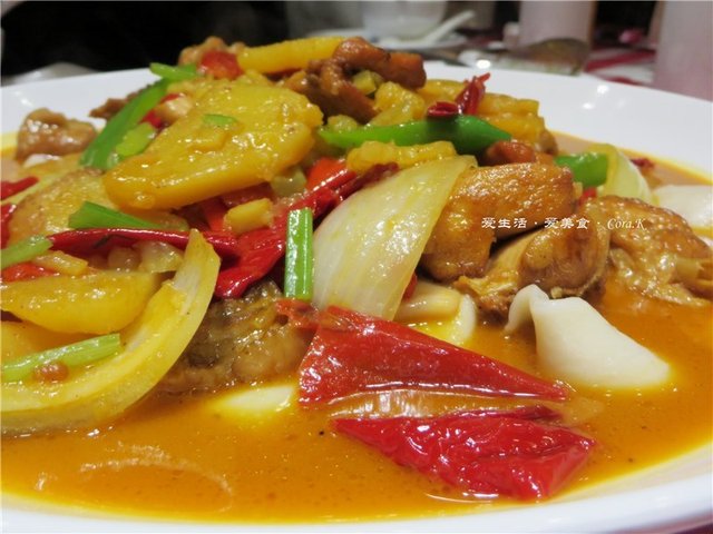 伊犁辣皮子烩大盘鸡:又一道让人惊艳的菜品,火红的伊犁辣皮子可配菜亦可主菜,微甜微辣且皮一点也不硬,口感爽脆,金黄的土豆片似乎还让我吃出了奶油味,垫底那雪白的饧揪面形似裤带面,非常软滑筋道,完全拌匀后吸收了汤汁的味道亦可称得一绝。整道菜的缺憾在于鸡,鸡的肉质稍柴了些,不然可给满分。