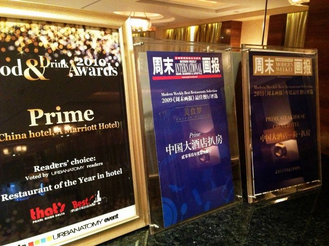 扒房室内外都有专门的位置摆放着近年获得的奖项。