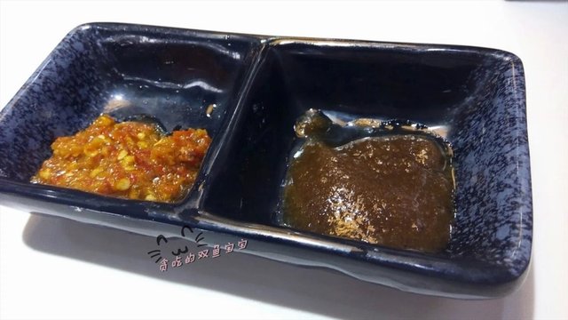 配了辣椒酱和沙茶酱。蘸辣椒酱很好吃,沙茶酱味道稍淡了点。