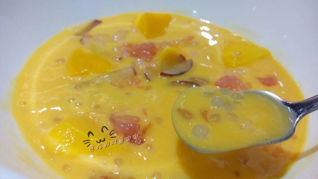 芒果打浆加入几小块芒果肉和提子丝西柚粒西米粒。杨枝甘露各家有各家的做法,它家的做法就有点欠缺了。首先芒果浆太多,因为芒果肉提子西柚都太少了,一下就吃完,所以感觉整个甜品吃下来是稀稀的。其次,西柚太苦太涩了,真心影响口感,芒果一般。