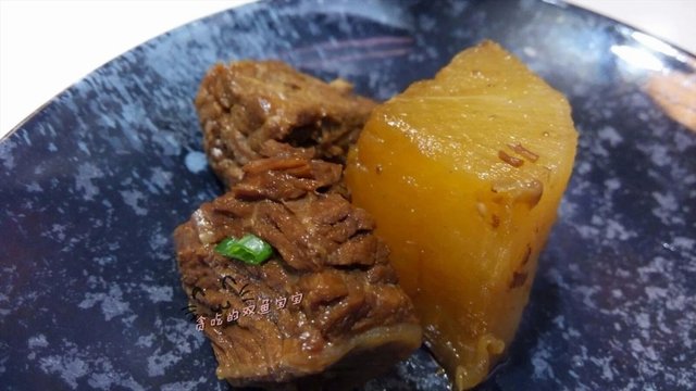 这道菜很快就上桌,可能就是一大锅焖好,点菜后就盛入烧热的石锅中,立刻上桌。除了几件长相比较好的牛腩,其余都是牛筋或者是牛碎肉的感觉o(╯□╰)o小时候老爸就爱焖牛碎肉吃,所以我还是知道的,牛碎肉既便宜又美味,就是有油脂的部分肥了点还有牛骚味比较重。萝卜不会太淋,三分二没入味,还是清爽的口感。至于牛腩蘸了辣椒酱的味道,就是南关阿姨牛杂的味道。
