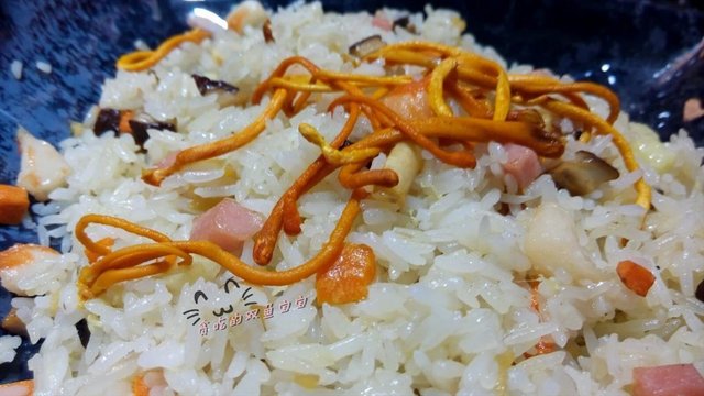 其实就是香菇虾仁火腿粒煎蛋虫草花等食材做的炒饭,米饭很入味,饭粒很干身弹牙,味道分布均匀。由于菇粒是干菇泡发的,于是味道比用鲜菇的香,但也有干菇的那种苦味。