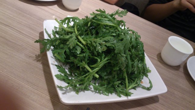 好不容易,终于上菜了,因为这边的青菜不多,我又是一定要吃青菜的人,其他都吃过了,就点了一份茼蒿试一下,老实说一上来的时候吓了一跳,竟然是生的,又不是大火锅。