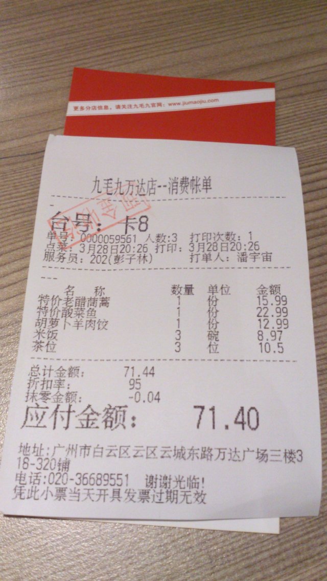 三个人吃完才发现竟然才吃了71块多啊,那个南瓜粥等好久都没上来就取消了,这家九毛九上菜实在是太慢了,虽然价格便宜,但是实在没那么多时间在这边耗着呀,因为等位的时候超过了15分钟,所以打95折。