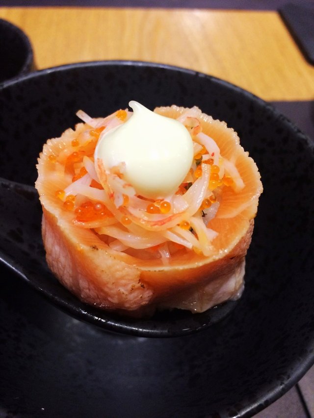 蟹肉三文鱼彩虹卷,55元一份,上来感觉有点惊呆呀••好像花之恋呢••好大一个,外面两大片三文鱼厚切,正!稍微炙烧过~~~中间是饭团还有彩虹色的丝状物,萝卜丝之类的•••感觉很抵呢•••6个花之恋才55呀••••