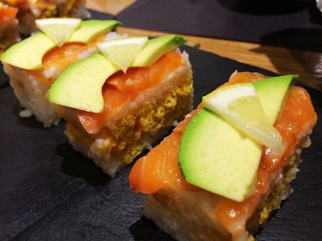 牛油果三文鱼千层 48元一份六件,里面千层有粟一烧,好特别的感觉••••