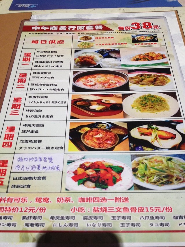 这个是中午商务套餐的餐牌,每天都有38元一份的特价套餐,价格得力。