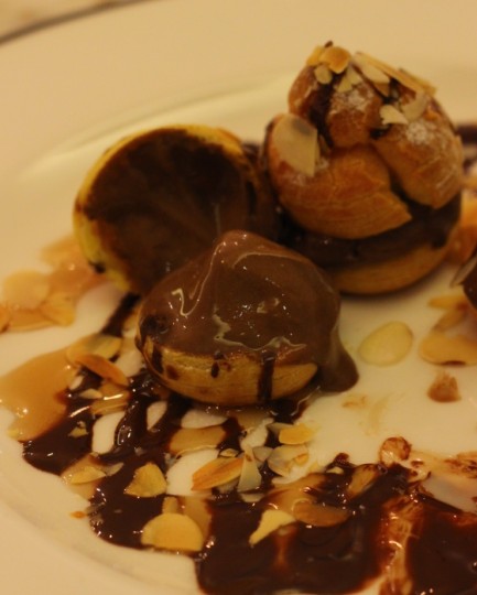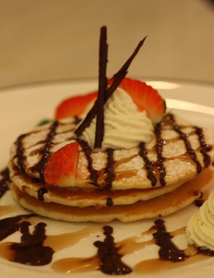 好像这段时间吃的甜食真不少,这不,外出办公,又遇上一间甜品店,把还在工作的女友给拉了出来,搞了个甜蜜的午餐吃。先是一份类似早餐的东西,名字给忘了,看着很普通,就是两个鸡蛋,一根肠,不过那鸡蛋煎得非常有技巧,特别的味道就是底下的酱,没有它们的支撑,整道菜可逊色多了。另外两款则是甜品,一个巧克力冰淇淋泡芙塔,个人不是太喜欢这种泡芙,有点硬,没有大个的那种好吃,而且里面的巧克力有点过甜。倒是那个草莓厚松饼还可以,女友还说可以学上,到时候自己做早餐用,就是顶上那个奶油酱有点考技巧。最后评价,价格偏贵,吃甜品和冰淇淋更划算些。