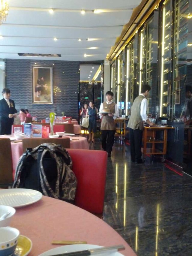不过从你不如电梯以后,应该就会开始有点小失望了,因为电梯真的好窄好窄,出门拐进几路弯曲的路,进入一个大厅,其实除了单面全落地式的玻璃幕墙,还真没太大的惊喜,甚至连个很大气的门面都没有。只是装修风格上有点欧式,包括水晶灯和桌椅等等。餐具也属于简单式的,没有很欧式很奢华的讲究。