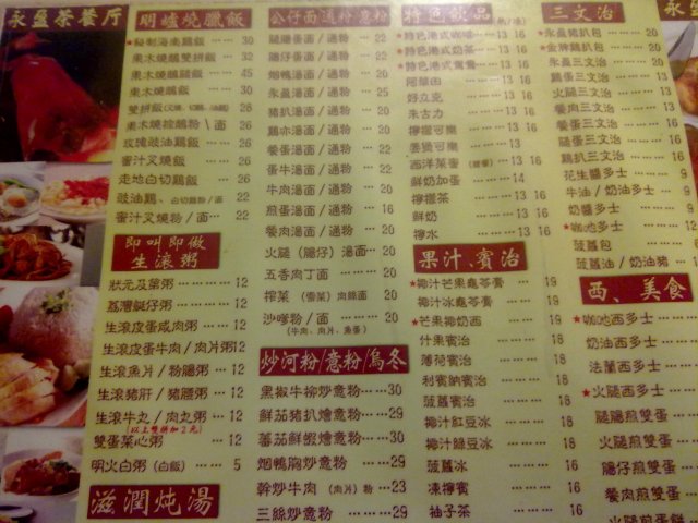 永盈茶餐厅应该也算是一个比较老字号吧。。记得第一次来北京路也是吃这里的一碗鲜虾云吞。。那时候刚来广州。。。差不多二十多块钱一碗对于我们学生还是感觉比较贵。。里面就是几只的云吞。不过这里面的确是有的原只的鲜虾。。汤汁的味道也是煲的很有味道。。