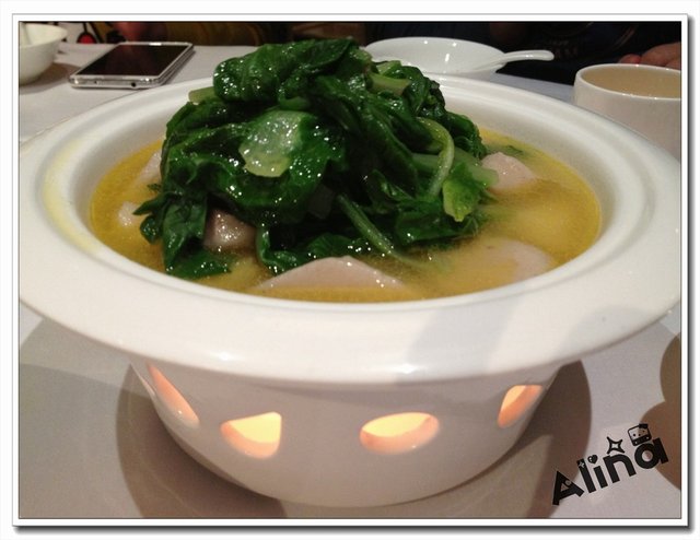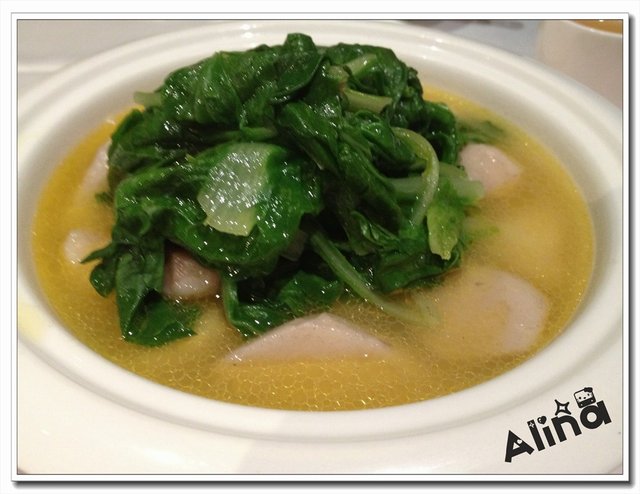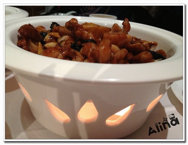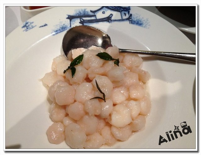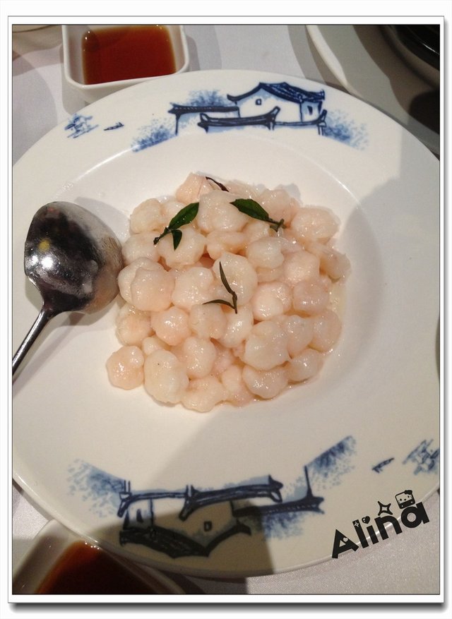 水墨江南的盘子配上玉白的龙井虾仁很精致,爽口的虾仁带有清清的茶香味。