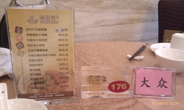 菜式很多,而且上菜的次序也比较正规,不过因为菜太多就乱上一通,这个就是高级酒店跟一般酒楼的区别吧。