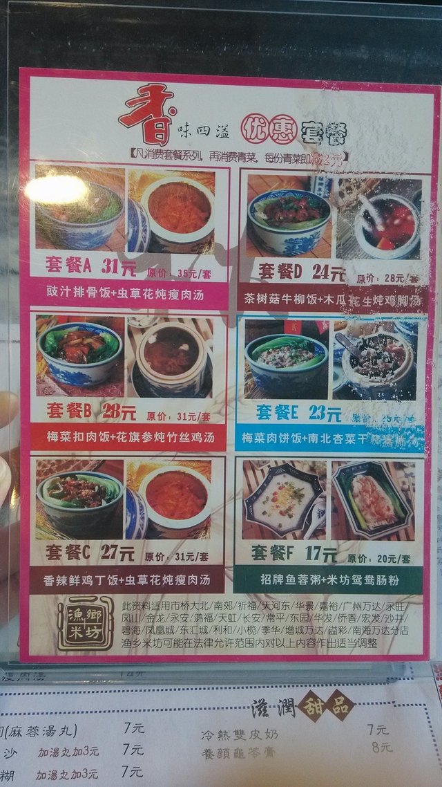 逛完街在路上来个下午茶。工作日有個優惠是消費粥可以加3塊錢有腸粉。點心或者是甜品這樣。漁鄉米坊是有挺多東西吃。飯。粥。腸粉。點心和燉湯都有。很多時候都過來這裡開飯。價格也不貴。但是要小心茶水服務費呀。2塊錢一杯茶我就真的不要啦。直接不要茶水。