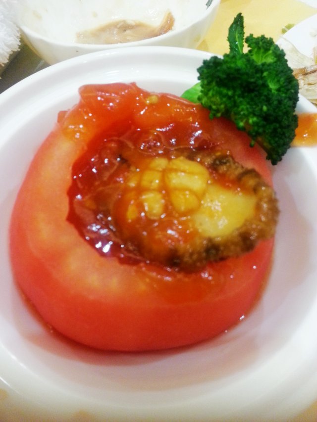 番茄鲍鱼:推荐的好菜,每人一位上的,精髓不在里面的鲍鱼··而是番茄里面的汁,番茄囊汁非常鲜甜···赞一个。