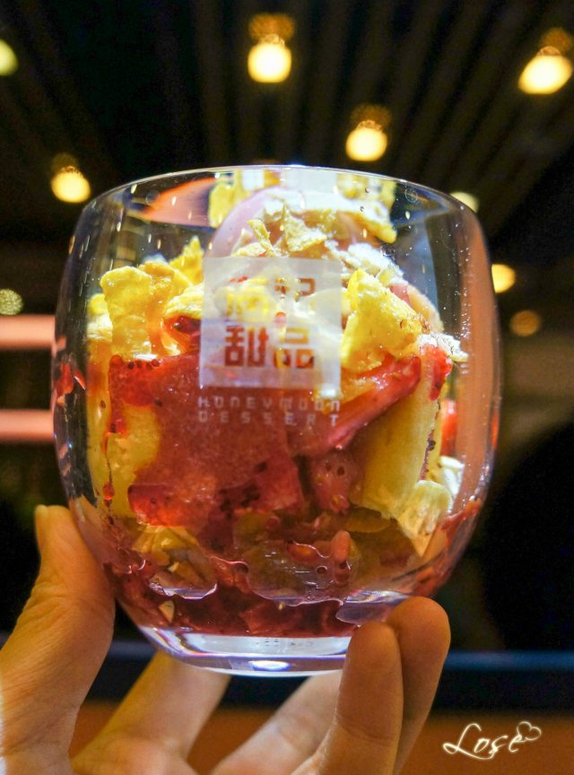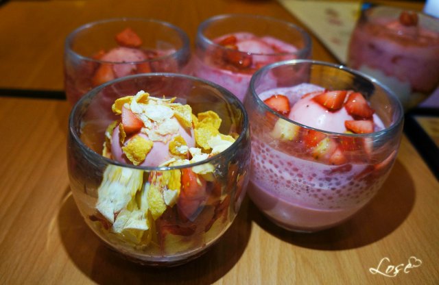 西米露会有D硬化,加上切粒的草莓及野莓乳酪雪糕