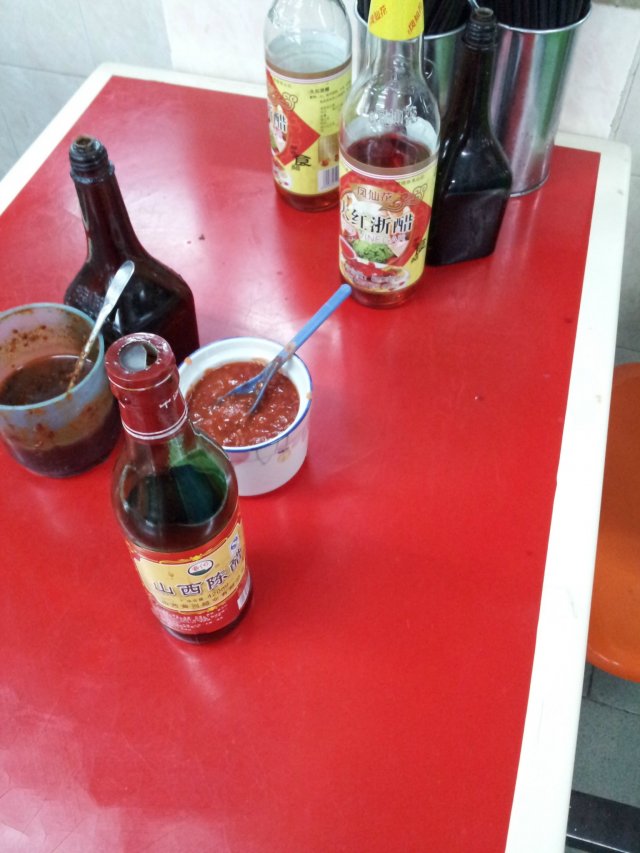 人流量一般,桌面还算整洁干净,提供了各种酱料可供选择。
