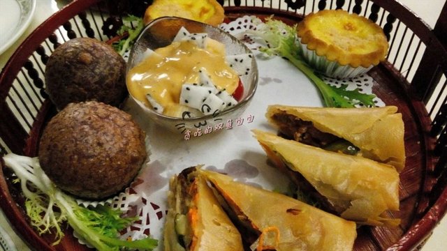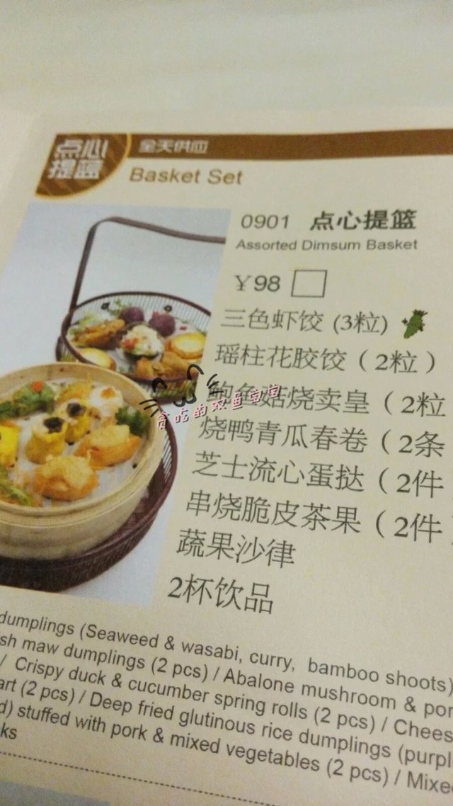 首先上来的是点心提篮,111元。包括:三色虾饺(3粒);瑶柱花胶饺(2粒);烧鸭青瓜春卷(2件);芝士流心蛋挞(2件);蔬菜沙律;杂果宾治冰;传统红豆冰。提篮的上菜形式比较新颖,但是感觉散点会更好,提篮就是一个噱头而已。
