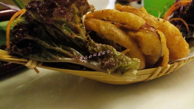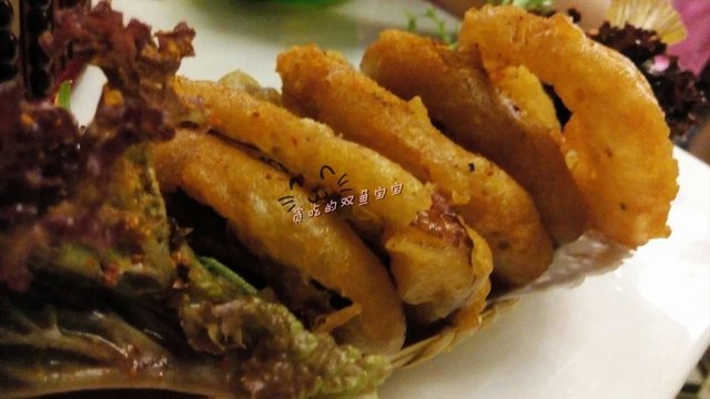 点指洋葱圈,9.9元,两颗星:跟洛奇先生餐吧吃的洋葱圈不同,这里的洋葱圈裹粉比较厚,炸的时间比较久,所以洋葱全熟不会有呛味的,但是很油腻。这里的洋葱圈倒有点像清远的糍,就是用粉浆裹了青椒、茄子等蔬菜炸的食物,类似天妇罗。
