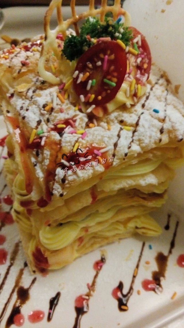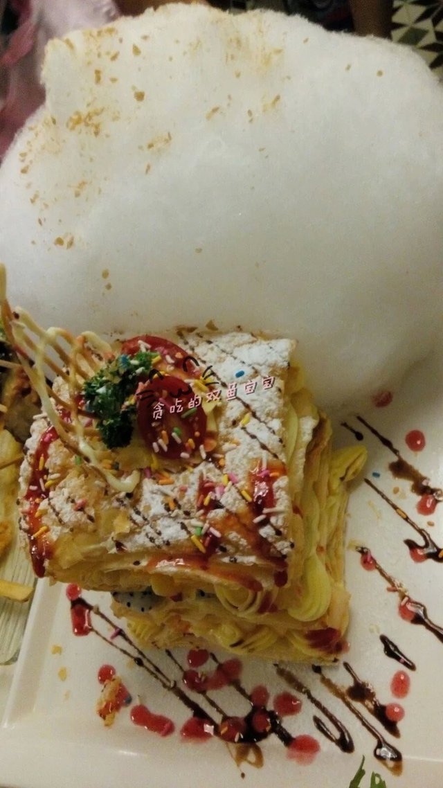 爆炸棉花糖拿破仑,一颗星:爆炸棉花糖+杂果拿破仑。这款拿破仑确实很能吸引眼球,上菜的时候隔壁桌都为之震撼,估计他们恨不得拿起手机拍张照片的。爆炸棉花糖,就是棉花糖上面撒了些爆炸糖(跳跳糖),但是不会炸到口腔很痛的那种,挺好玩的。杂果拿破仑,叠得很高,所以我们一般都不会点来吃,因为有点无从下手的感觉,最后还是没办法。店员很贴心地拿来了刀和一次性手套的。拿破仑不喜欢吃,就是那些类似很蓬的泡芙的饼皮,不脆,还涂了超级多cream的,吃一点都很腻了,直接跳过,还好杂果是良心出品,都是鲜果,有芒果、哈密瓜和火龙果的。吃了一半棉花糖和全部水果就完结了,好浪费啊。