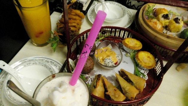 灯光昏暗,桌子也很小,真的很小很小,不得不吐槽!刚开始店员安排我们坐在一楼楼梯下方的桌子,好吧,这里容易吃灰尘,我们就上去二楼,但是店员安排了小桌给我们,我说了是试吃的,桌面肯定放不下的了,而且灯光不好,然后店员还是固执地让我们坐小桌,说会边吃边上菜的。好吧,结果是上了提篮就和两杯饮品台面就没位置了,于是我小小抱怨了一下,有点不爽,不过也就算了。
