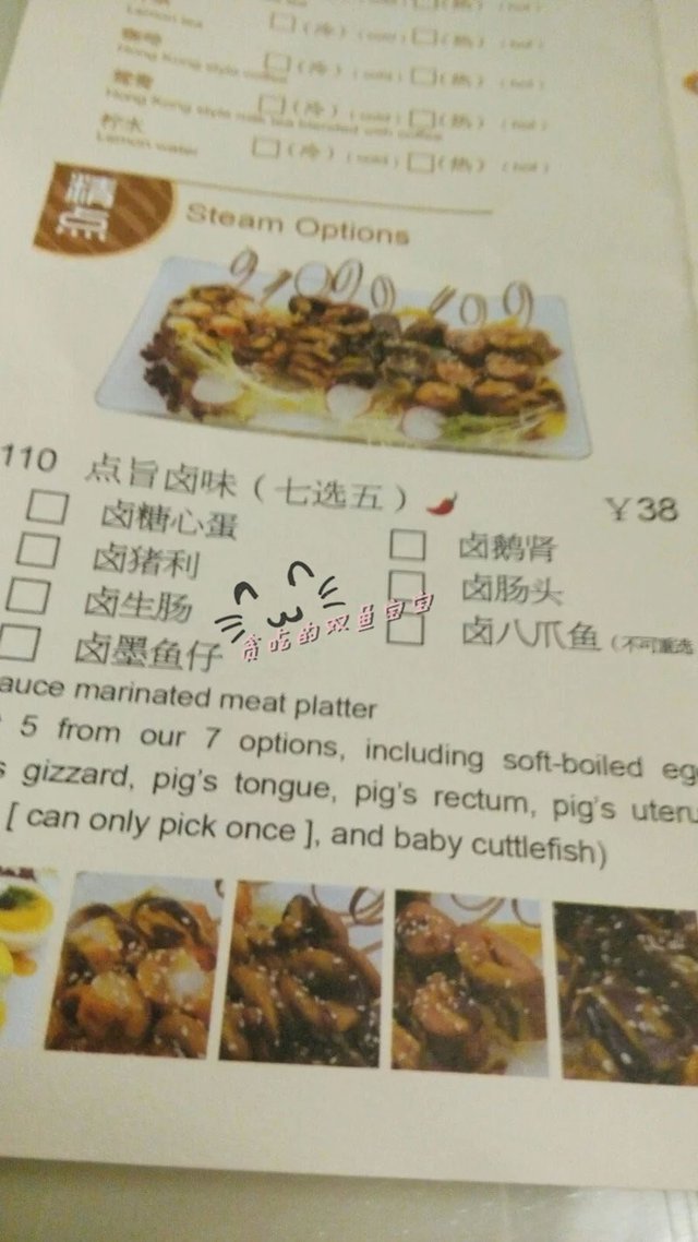 点指卤味,38元:5串卤味,没有卤肠头。这里的卤味都是不会煮得很软烂的那种,比较爽口,适合下酒吧,但是女生吃就不大好,因为真的有点难嚼。卤生肠、猪脷、鹅肾、八爪鱼好吃,但是都不够入味的,墨鱼仔不好吃,完全没有卤水味道。