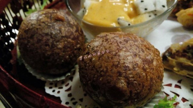 串烧脆皮茶果,三颗星:对于爱吃紫薯丸的我,很爱吃外面那层紫薯糯米,但是里面的馅是咸的,要是换成红豆沙就更爱了。