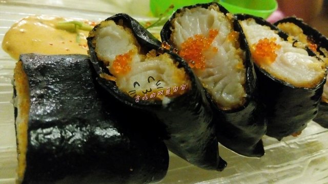 墨汁吉列鱼扒肠粉,22元,两颗星:电视里看到了这款墨鱼肠粉,挺期待的,但是两颗星是给吉列鱼扒的。墨汁肠粉挺有新意挺有噱头的,但是感觉跟萨莉亚的墨汁意面差不多,墨汁肠粉是有点苦的,老实说,我只吃了一小口就直接略过了。吉列鱼扒就是炸鱼扒,比较香口,但是鱼味比较淡,上面有几颗蟹子,比较腥。配的应该是黄芥末。