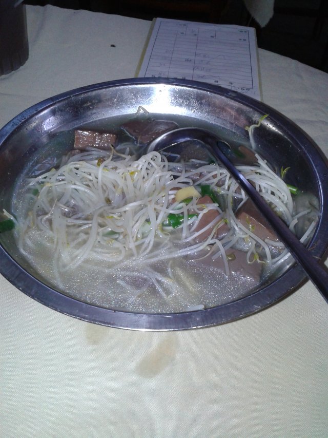 胡椒浸鹅血18元,用个不锈钢大盆上来,里面有鹅血、豆芽,鹅血很新鲜,吃起来很滑,浸过鹅血的汤喝起来也很甜。