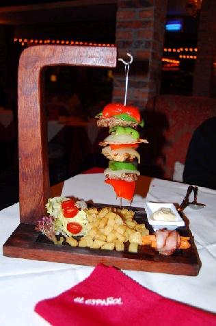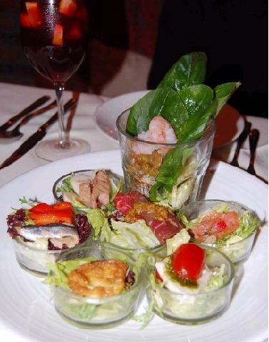 今天的菜单里面,有5道菜式:圣格利亚红酒(配面包)、经典小食拼盘、招牌海鲜饭、肉类串烧、提拉米苏。