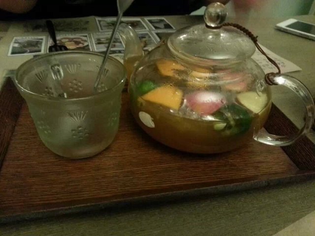 水果茶:选了冰的水果茶,平时我就很喜欢喝水果茶,不同的是这里的水果茶水果特别多,水果种类也蛮多的,而且加了百香果哦,喝了一般之后发现原来还加了话梅,特别解腻,很喜欢。平时喝不完一杯的水果茶,这杯被我喝完了。