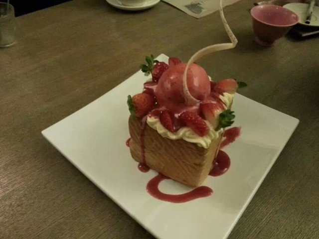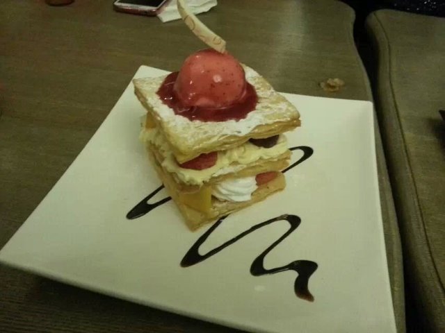 法式千层:特地叫起甜品最后再上的,一直很喜欢吃千层啊,之前就特意去翠园吃个水果千层,但是太大了,而且很贵,这边这个大小适中,口感酥酥的,而且水果也不少,值得一赞的是草莓,又大又红。不过吃多了还是略微有点腻,搭配着水果茶和最适合了。