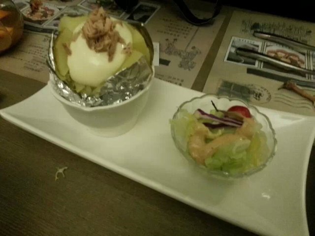 吞拿鱼薯仔头:卖相不错,一上来就先把旁边的沙律吃了先,薯仔很粉,搭配吞拿鱼和美乃滋,微甜,又不会太腻,两个人分着吃正好,不错的小吃。