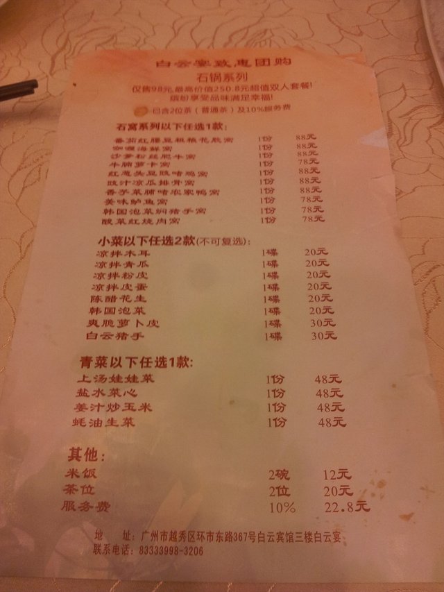白云宴99元团购套餐,内容有:石窝系列10选1、小菜8选2、青菜4选1、还有米饭2碗。