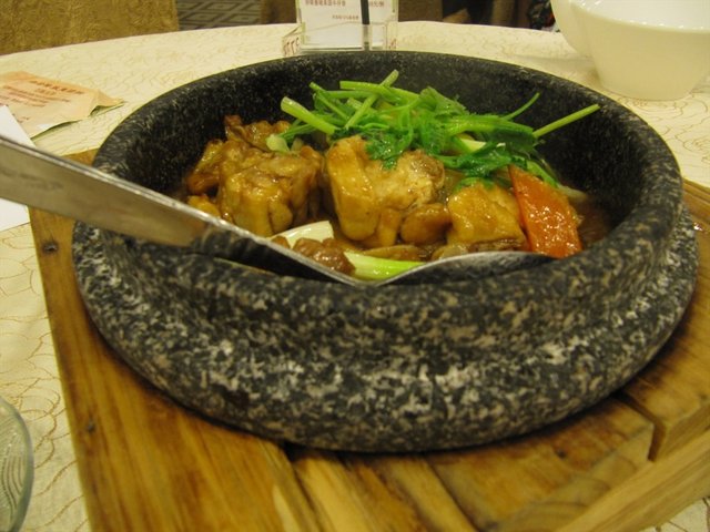 红葱头豆豉啫鸡窝(原价88元) 用石窝上来,分量不大,鸡质不好,鸡肉不结实,不过啫的很香、很入味,下饭不错。