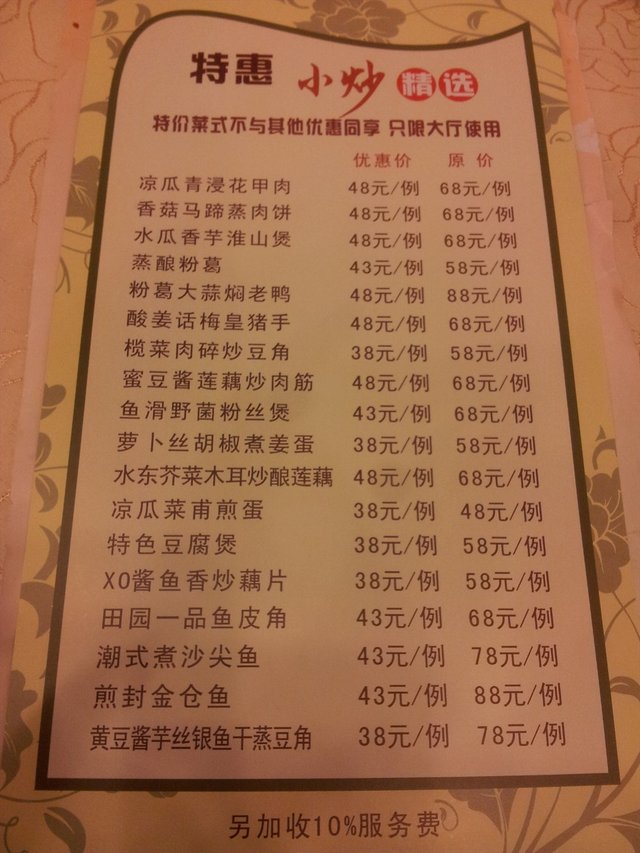 后来我感到吃的不够饱,想再点一个菜,服务员告诉我特惠小炒必须按原价点,而且还要加收10%的服务费。后来觉得不值得,就没有点了。