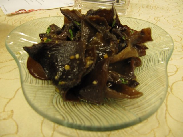 凉拌木耳 (原价20元) 用透明玻璃碟子上来,量不多,蒜蓉味道和老陈醋味道很浓,吃起来很爽脆。