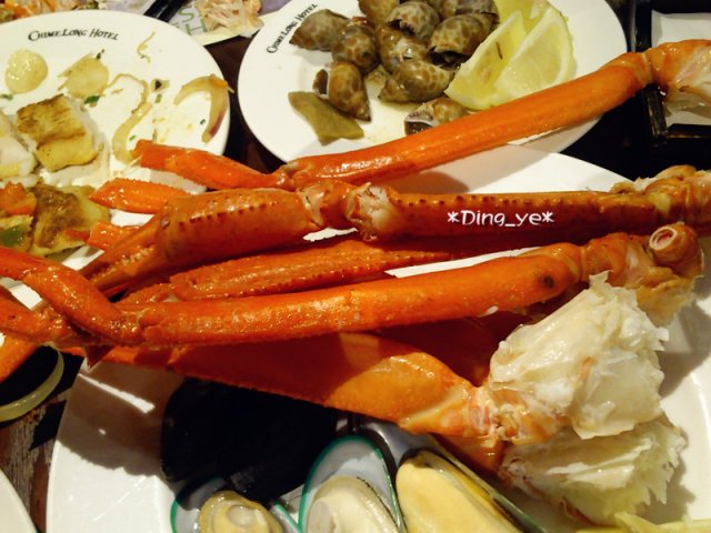 很快到了5点半,陆续进入餐厅,朋友两个立刻冲去了海鲜去,坐还没有坐下了,只留下孤独的我,只有等待。不负众望,看到她们满载而归啊~ 海鲜区有长脚蟹、青口、虾、生蚝、三文鱼刺身、墨鱼刺身等等。