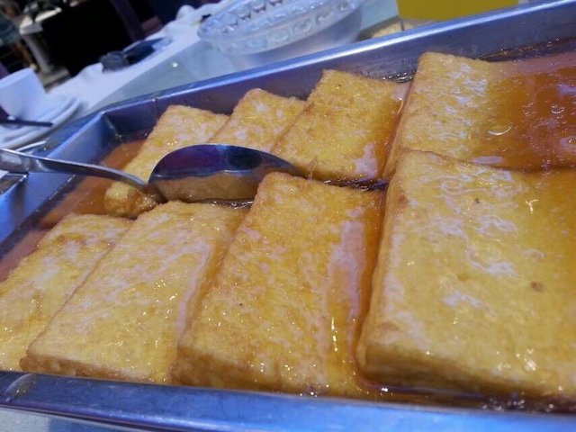 蒸豆腐,先炸后加卤汁蒸,外皮虽然不脆,但仍然保留着炸过的焦香,内里嫩滑,不用咬便滑下喉咙。