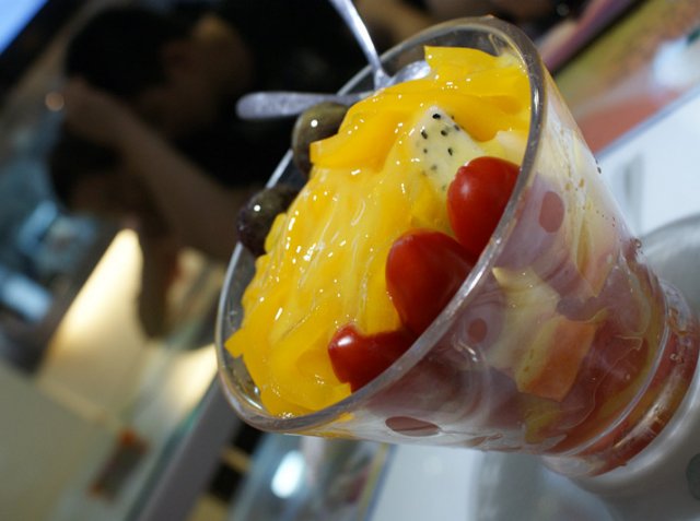 杂果拉面无图片噶精美~不过水果好多,如果全部都系原价噶话就呢个比较抵了~有火龙果,西瓜,苹果,西红柿,哈密瓜、杨梅等等~图片仲有奇异果~甘噶话色彩比较斑斓~但系依家比噶杨梅好乌黑个样好惊悚~影响美观同口感~觉得酸~“拉面”其实系芒果味噶水晶果冻条~口感5错~而且个芒果汁味好香~味道5错丫~其他水果可能5应季都无咩味~西瓜都一样,5甜~总噶黎讲就系靠分量充数~食完觉得好饱~哈哈