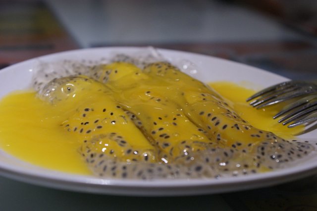 芒果水晶卷~本身系香芒黑糯米卷,但系去到话无~所以换左呢个,其实就系少左黑糯米,可能口感无之前噶丰富。中间噶芒果肉好香甜好好味~外面噶水晶卷其实就同冰燕一样系果冻~不过有密集恐惧症噶人肯定5敢食,觉得好多小黑点好恐怖~其实呢个纯粹系装饰用,口感无觉得有咩特别~芒果汁都好香~5错丫^_^