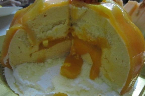 切开蛋糕,就有浓浓的芒果酱流处黎,但其实真正有芒果酱的部分不是很多,如果蛋糕内可以有多点芒果,或者芒果酱的部分会更多的话,应该会更好。