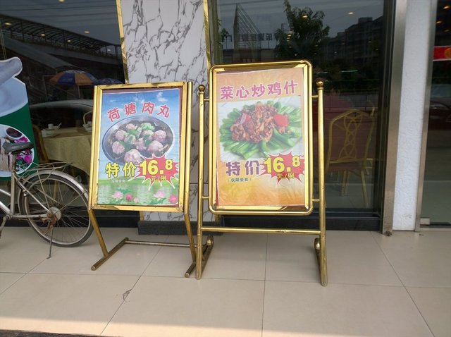 大门上方的粉红色字体的店名分外显眼。大门旁边的墙上、玻璃上,都有不少特价菜的介绍。