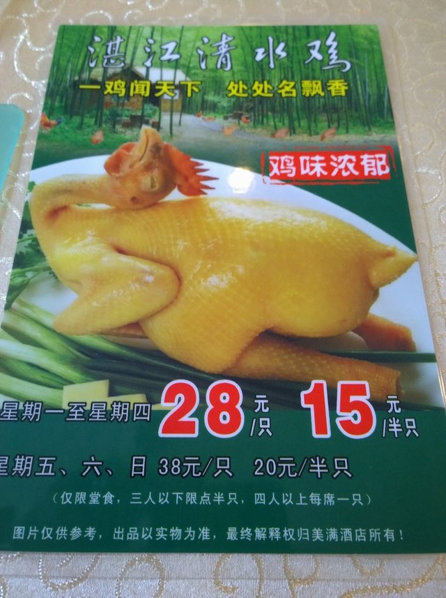湛江清水鸡 38元 周一至周四28元一只,周五至周日38元一只,而且要四人以上每席限点1只。