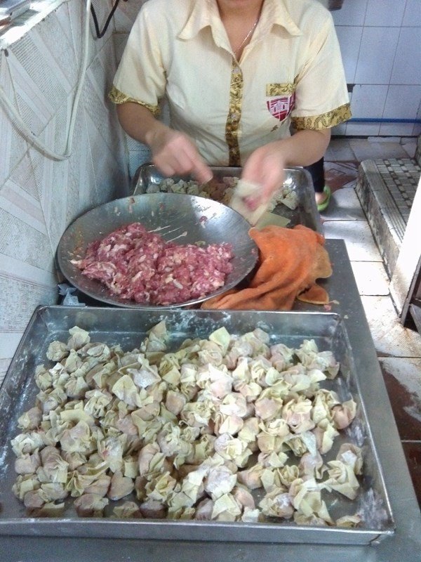 现场煮面现场包云吞,可以看到服务员现场操作,表面看并没有太多的花哨。云吞馅是猪肉,并没有虾,看得出大部分还是瘦肉,云吞皮比较薄,服务员包得很快,单手就可以操作,一手拿皮一手包馅。