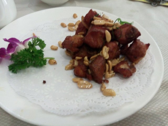这个应该是下锅炸完成的,炸得有点焦,是肉排,有的是肥瘦相间着的,不会显得太硬,太柴
