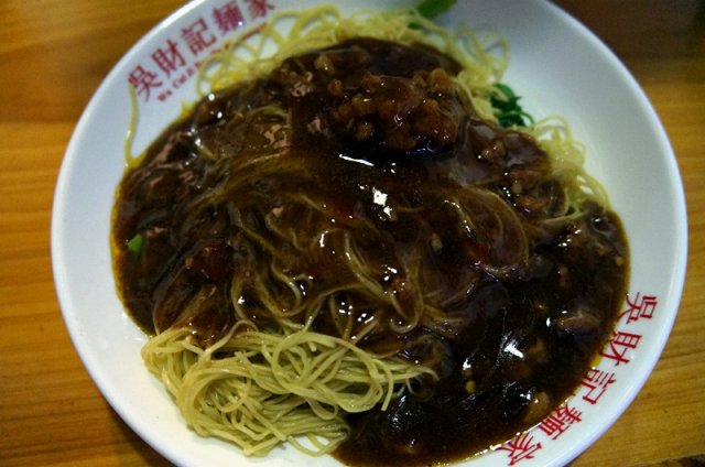 炸酱面,面条比较爽滑,拌上用豆酱肉碎一起特制的酱料,味道不错。