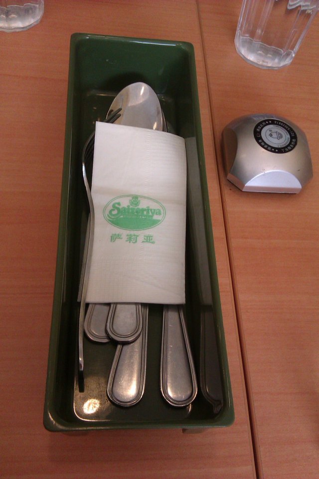 每张桌都已经放好汤匙、刀、叉和纸巾,而且桌面上有一个按铃,如果需要