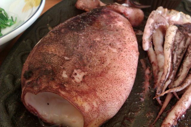 大鱿鱼,上桌时就是这样的,然后自己动手切成一小块,大家一起分享,鱿鱼煮得